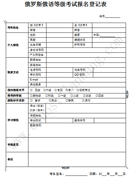 3、俄语等级考试报名登记表