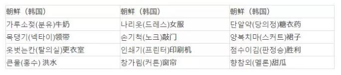 (注:叫法不同。朝鲜叫法都是意思的合成。韩国是直接的汉字词或外来语)