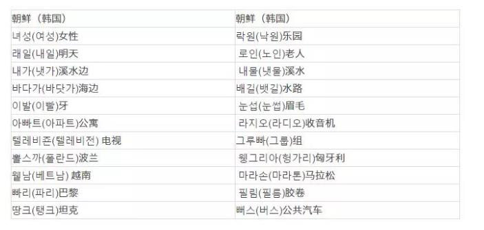 韩国因为头音法则尽量避免头音是“ㄴ” 或“ㄹ”的情况,而朝鲜依旧用着其汉字发音。所以韩国读作为‘여자(女子),연세(年岁), 요소(尿素), 유대(纽带)’,而朝鲜读做‘녀자, 년세, 뇨소, 뉴대’。